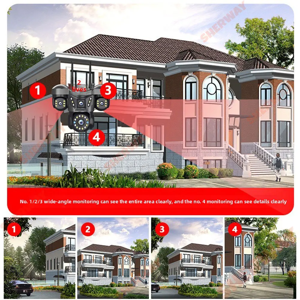 Four lens cameras simultaneously monitor four areas and display four images on a mobile application.
