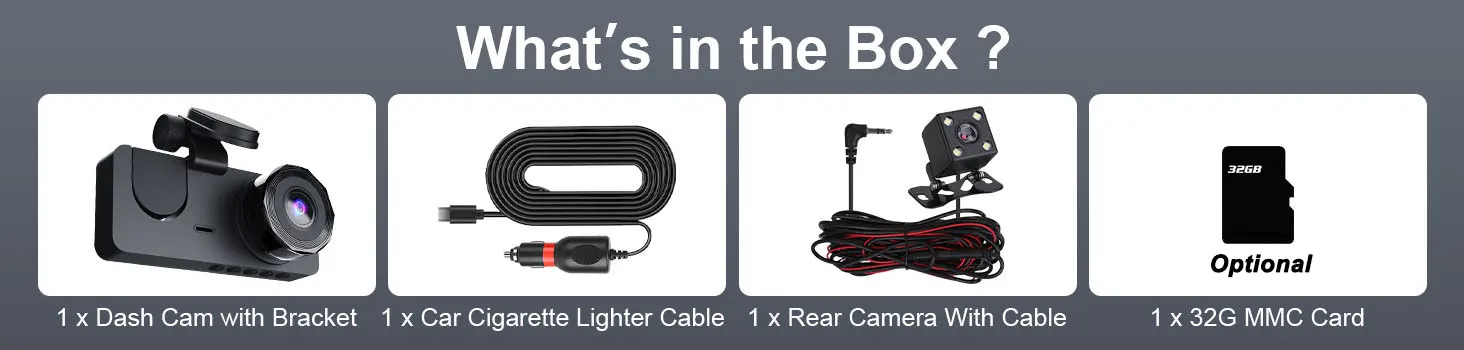 Dash Cam Front and Back: The dash cam comes with a U3 32GB card (optional). Plug and Play. The front camera can be easily mounted anywhere on the windshield and connected to a power source, while the rear camera is simple to install and can be used by connecting to the front lens without removing the reversing light