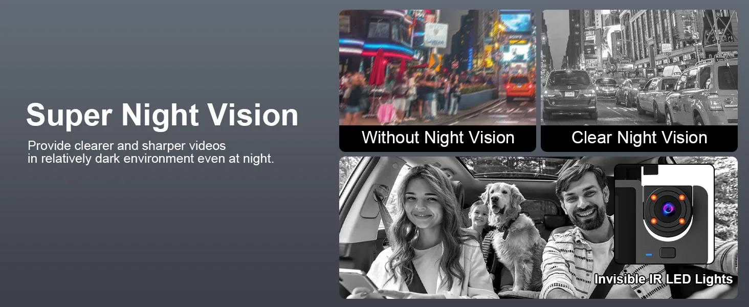 Dash Cam: The dash cam with super night vision and infrared cockpit light adopts f/2.0 large aperture, a total of 6 layers of optical lens and WDR technology, plus 4 infrared lights, which enable the car camera to display good color accuracy and clearly capture important details regardless of day or night