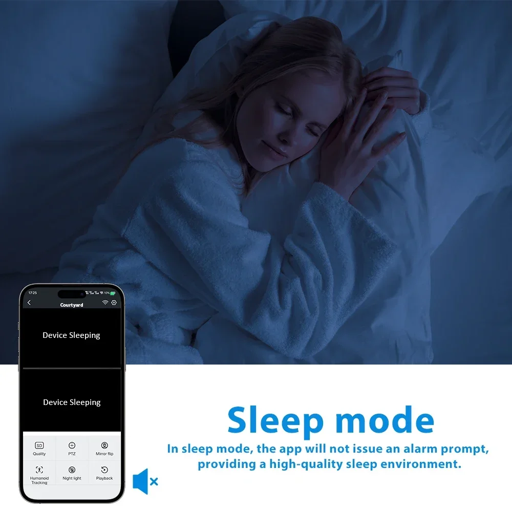 You can set the camera to sleep mode for any period of time, after the sleep mode is turned on, the camera will not monitor the screen in the time period you set, and the camera will work as usual outside the time period, which can greatly protect your privacy!