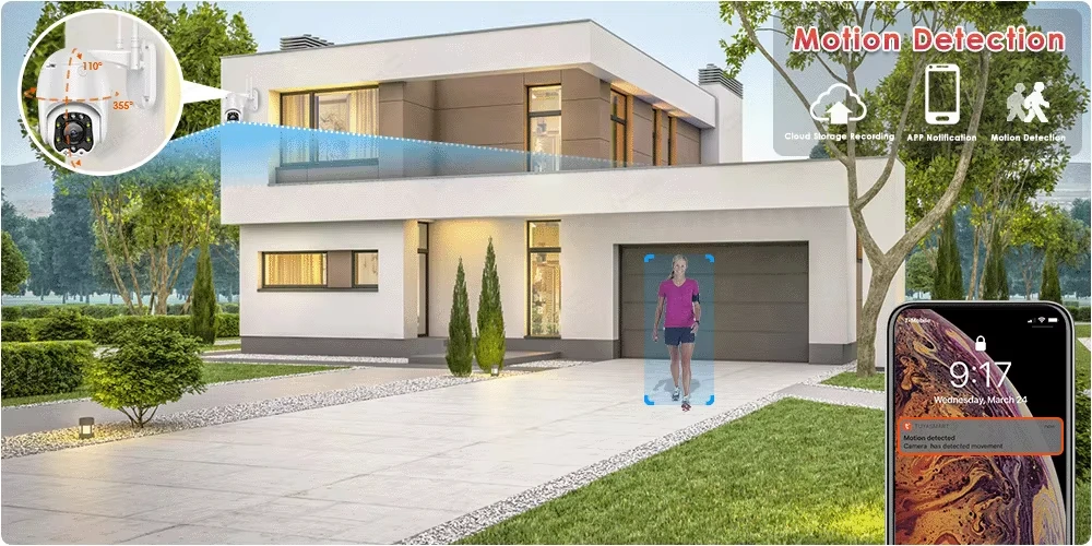 After locking the target, the camera will adjust the pan rotation automatically, Tracking Moving Objects, Cars, Pets, Human, and push alerts notifications to your Smartphone.