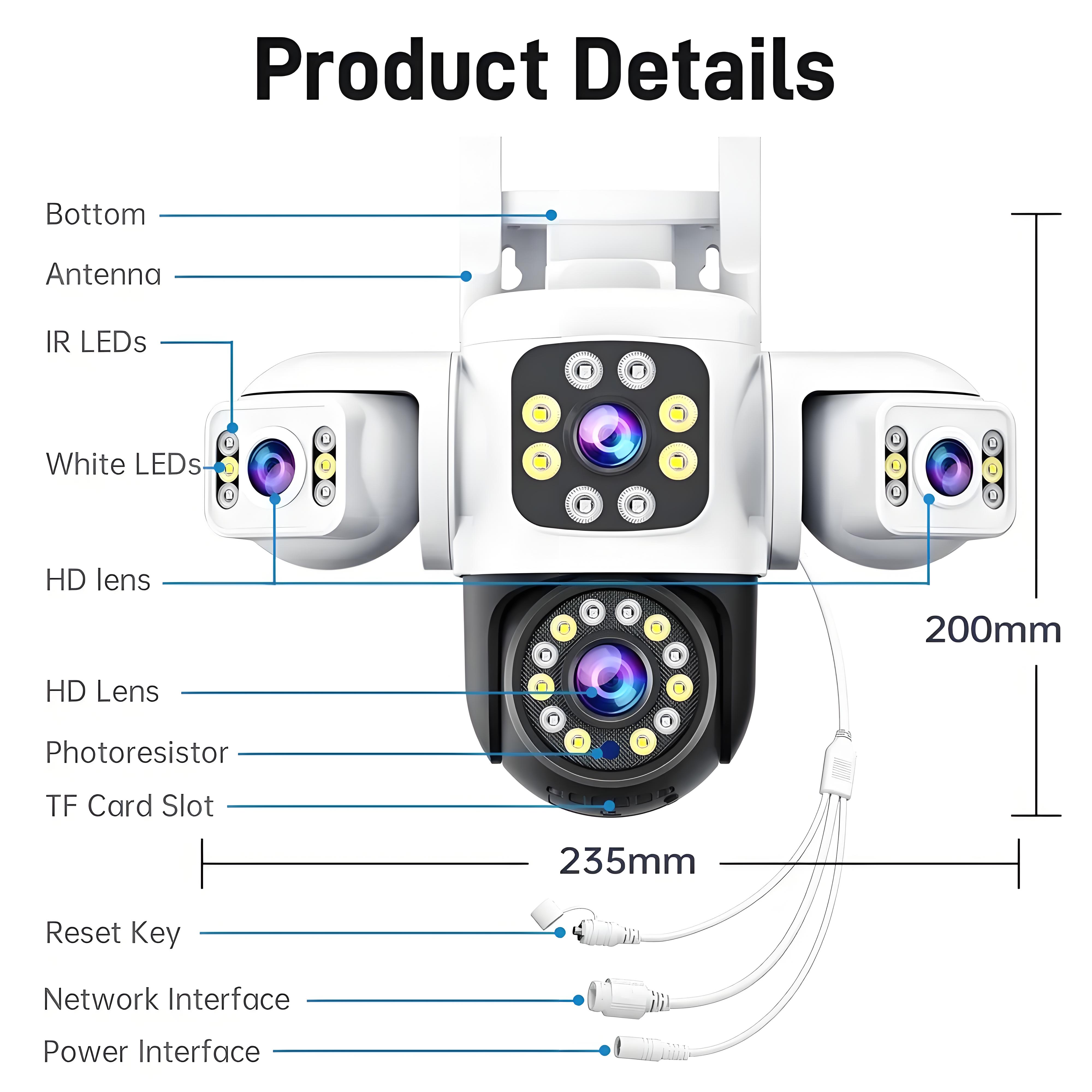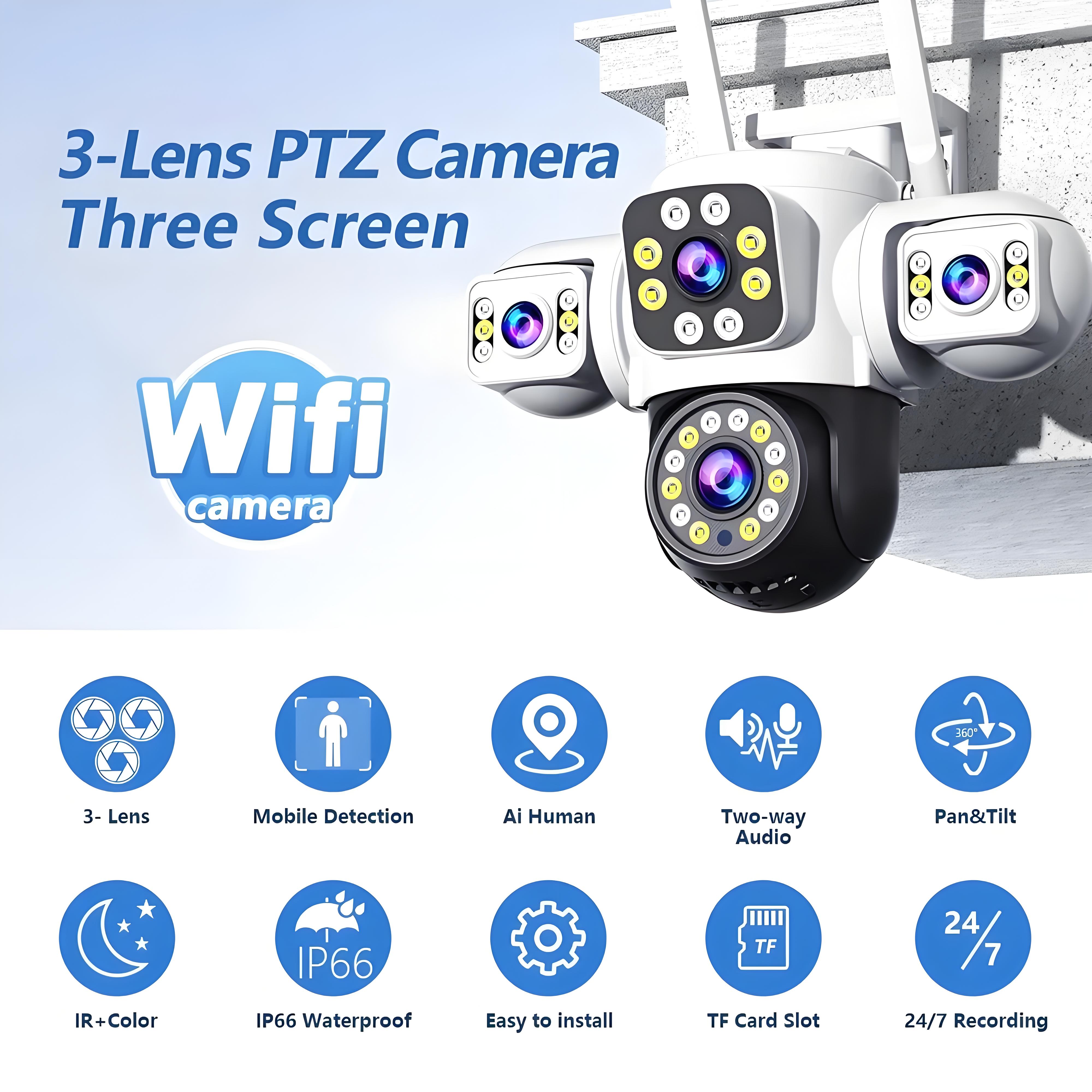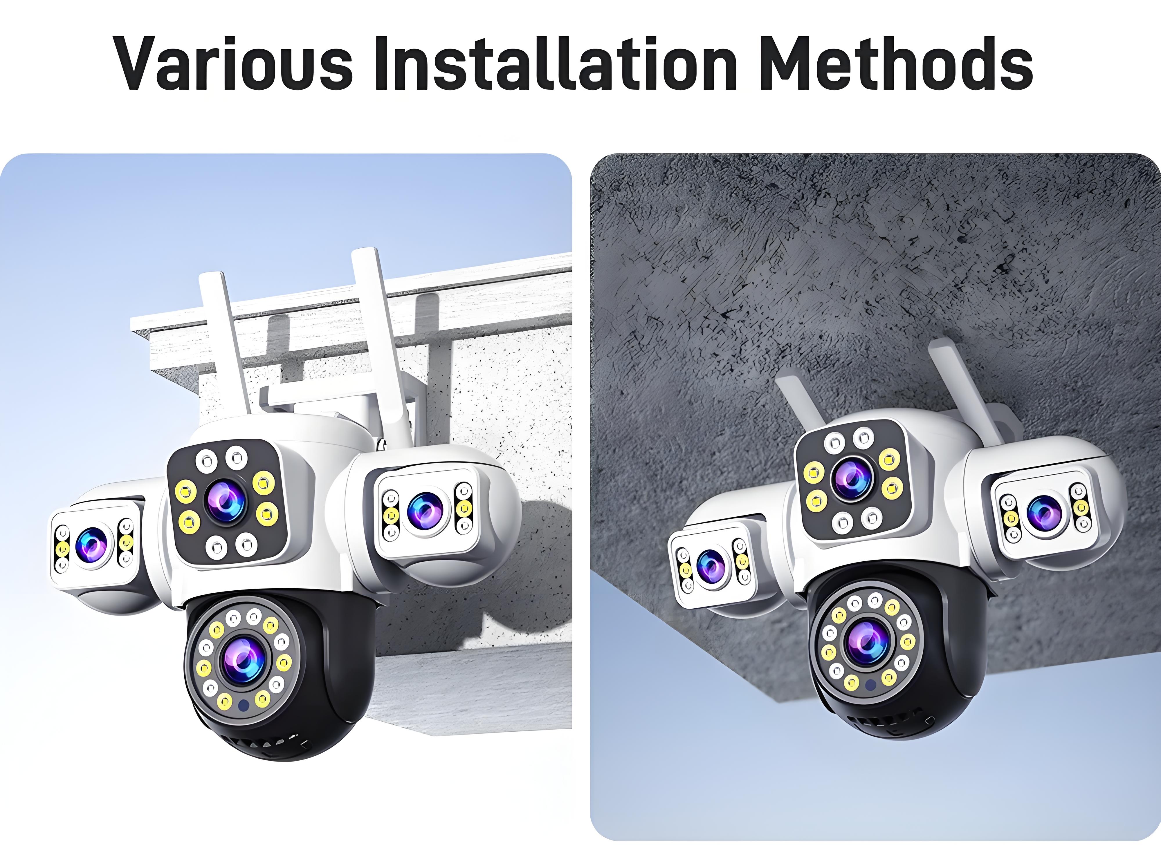 --3-screen security camera can capture more details from all angles. Compared to traditional single-lens, single-screen security cameras, 3-screen security camera can capture more scenes and areas.