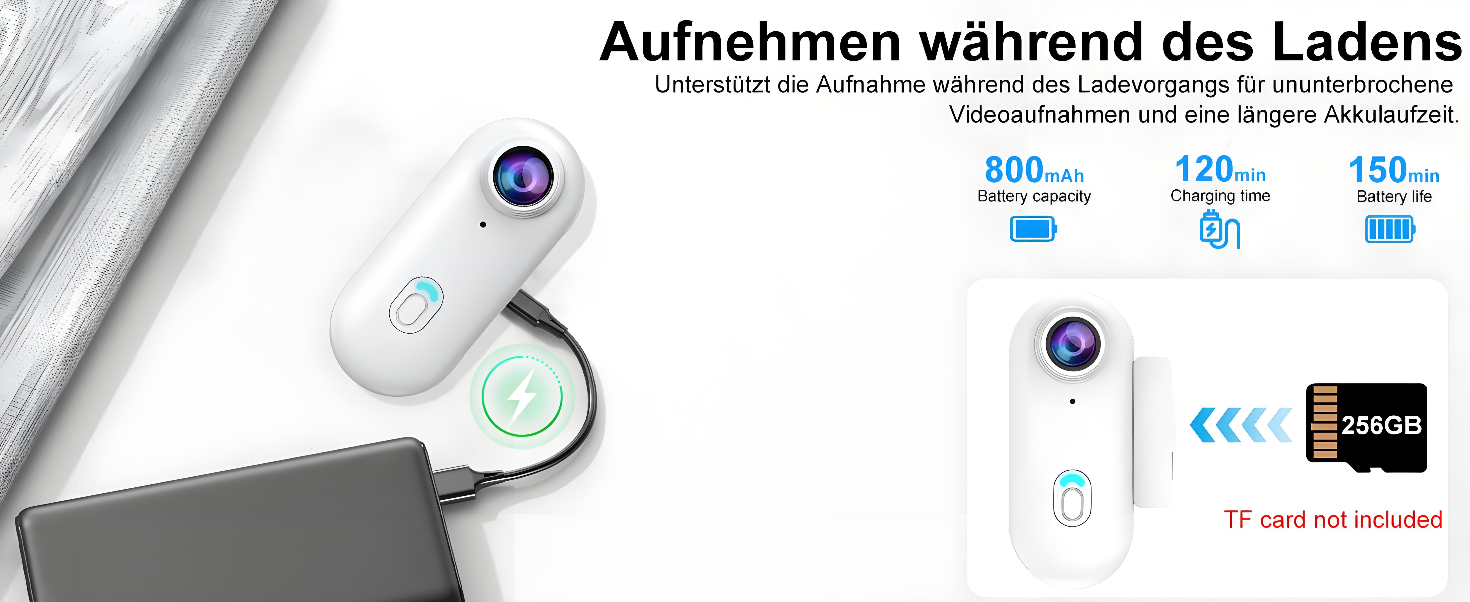 150 Minutes of Battery Life: This mini 4K action camera is equipped with an 800mAh rechargeable lithium-ion battery for extended use. It can continuously record up to 150 minutes of video in 1080P mode, up to 120 minutes in 2K mode, and up to 90 minutes in 4K mode. In addition, the camera supports recording while charging to meet your needs for long-term uninterrupted recording.