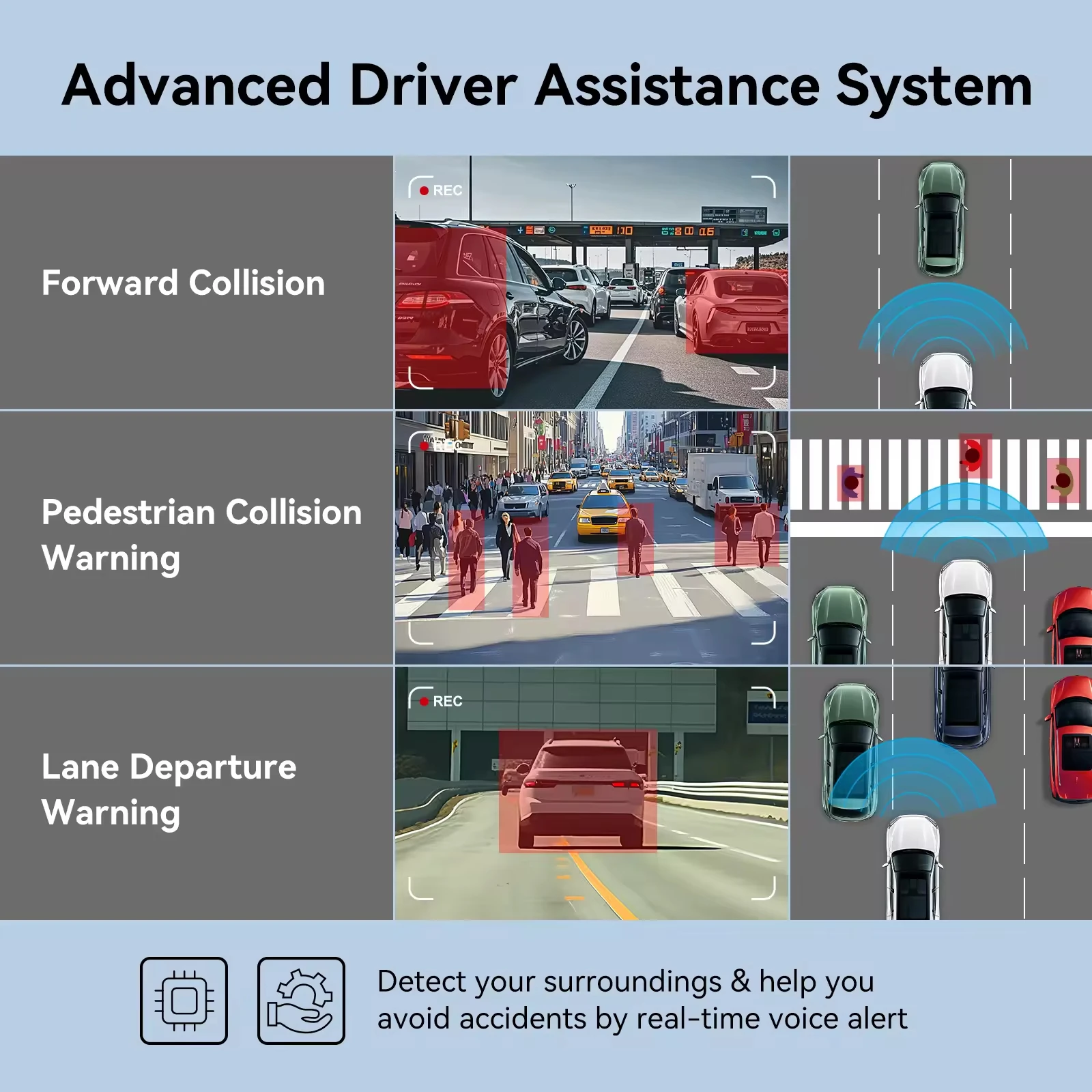 Safety is a top priority for any driver, and this dash cam includes an Advanced Driver Assistance System (ADAS) to help you stay alert and in control. The ADAS features include: