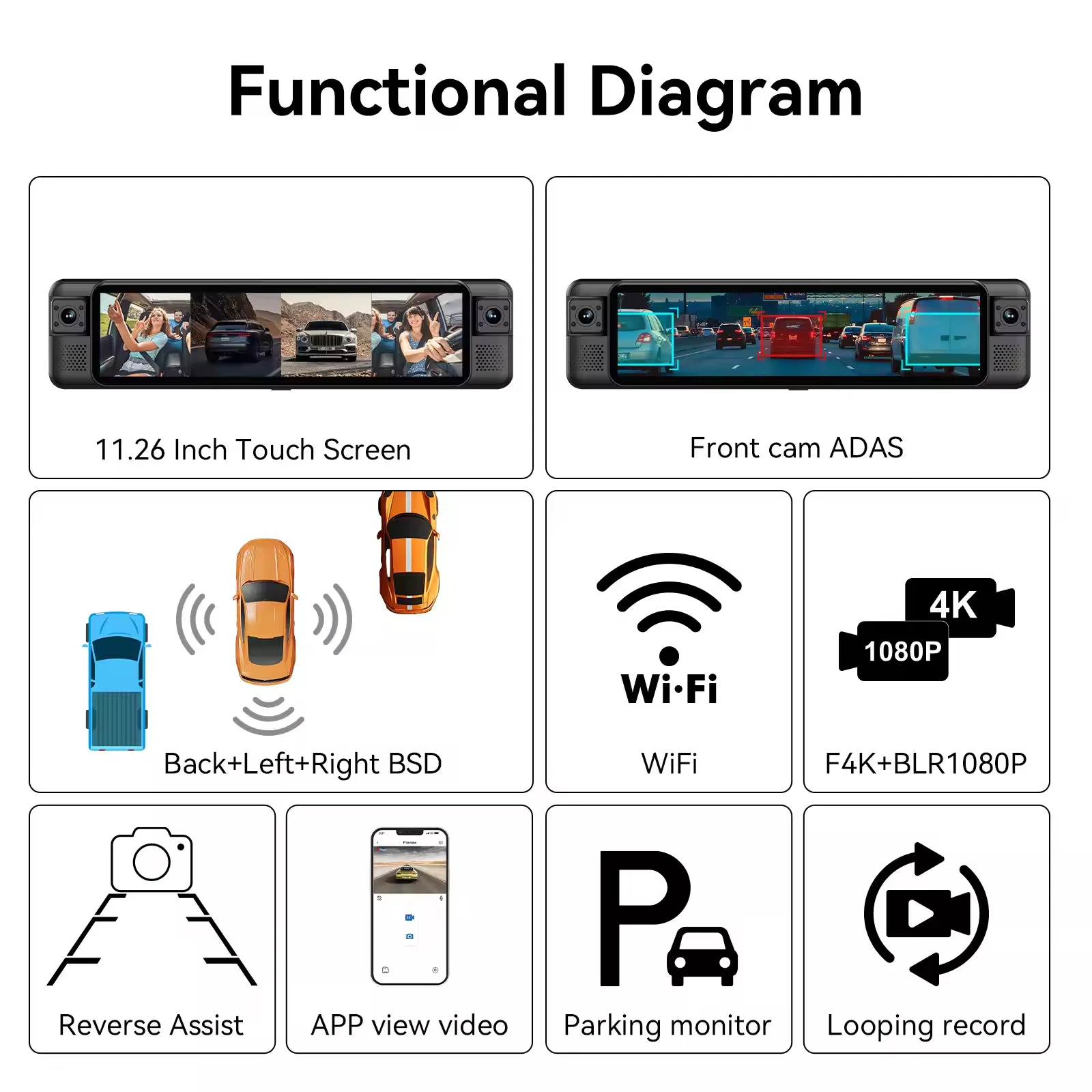 The touch screen is intuitive and user-friendly, allowing you to switch between camera views, adjust settings, and review recorded footage with ease. The mirror also functions as a regular rearview mirror when the dash cam is not in use, ensuring that you always have a clear view of the road behind you.
