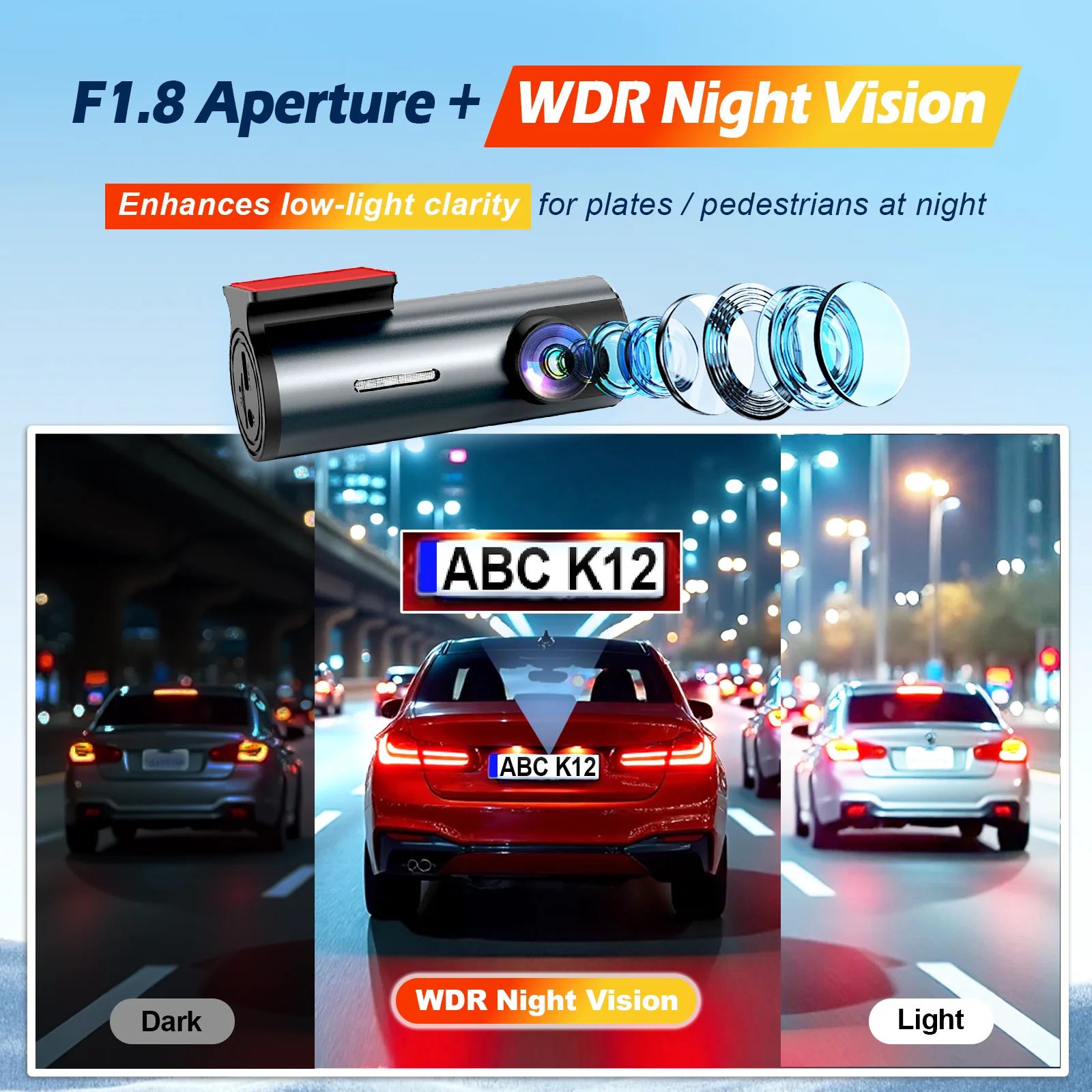 Dash cam front and rear provide F1.8 aperture. Dual dash camera could clearly record vehicle status at night.