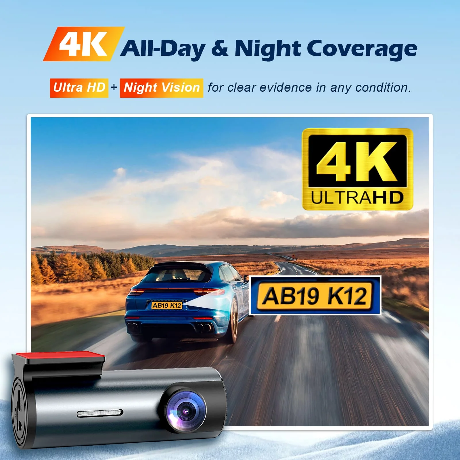 3840x2160P front-facing camera and 1920x1080P rear-facing camera recording. Ensure your driving safety.