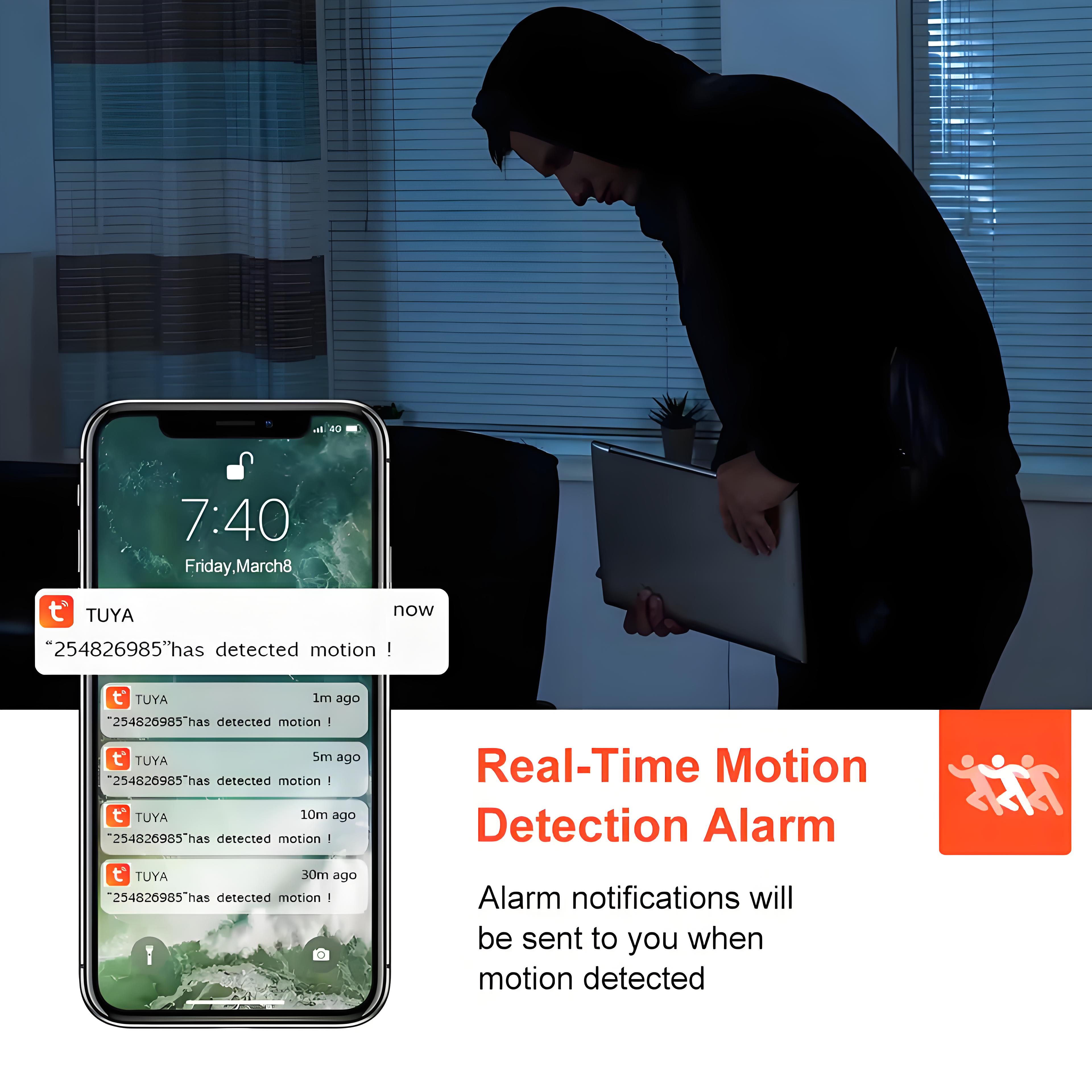 When the camera detects a person or a thief come in the surveillance area, APP will push notifications to your mobile phone. Any suspicious movement thrown into the camera' eye will be detected and recorded, let thieves and robbers nowhere to hide.