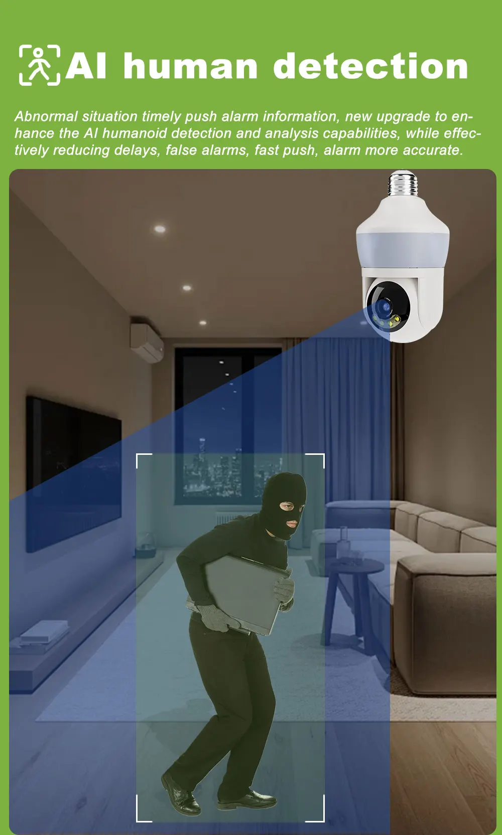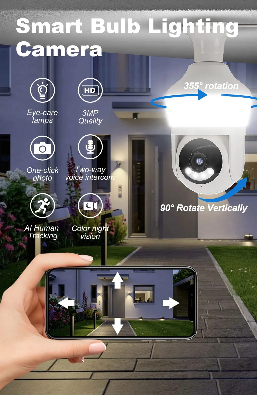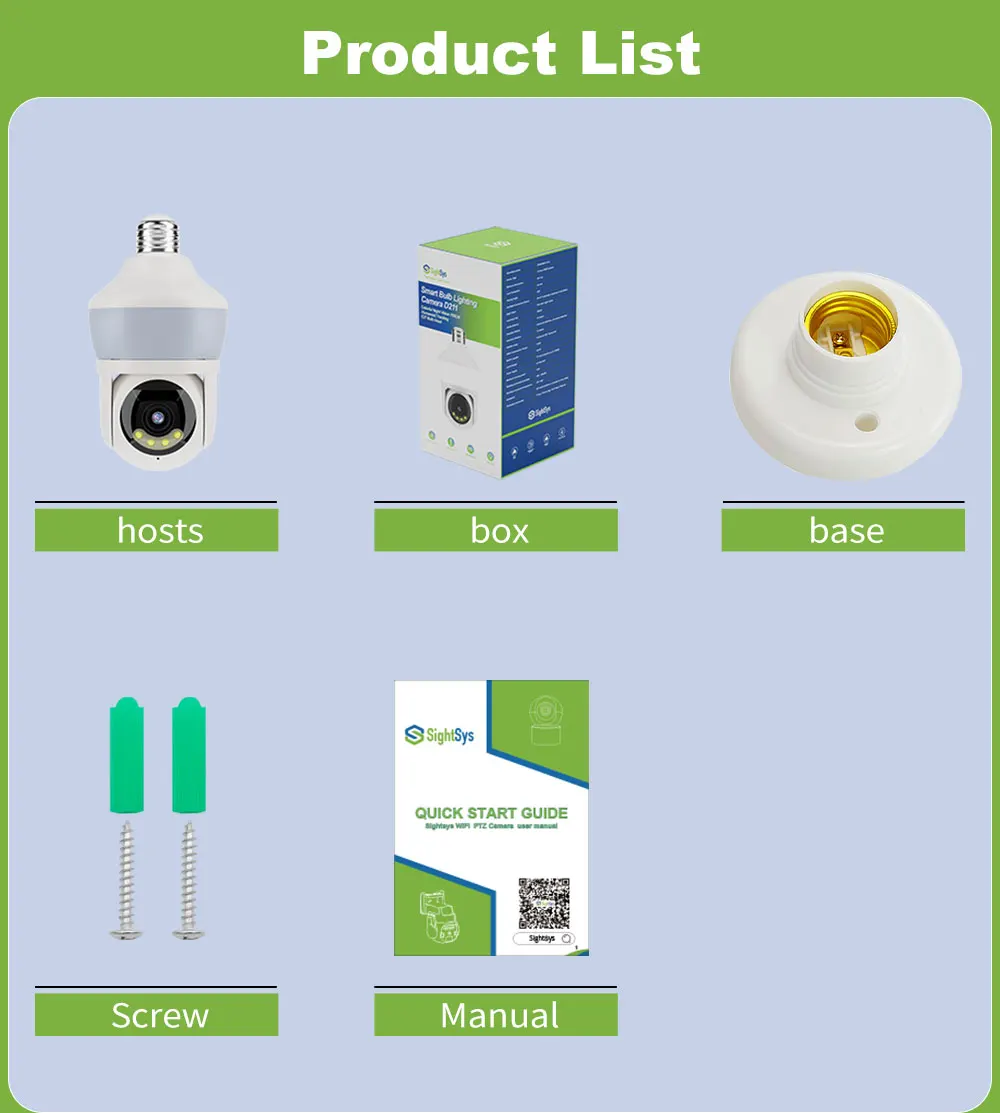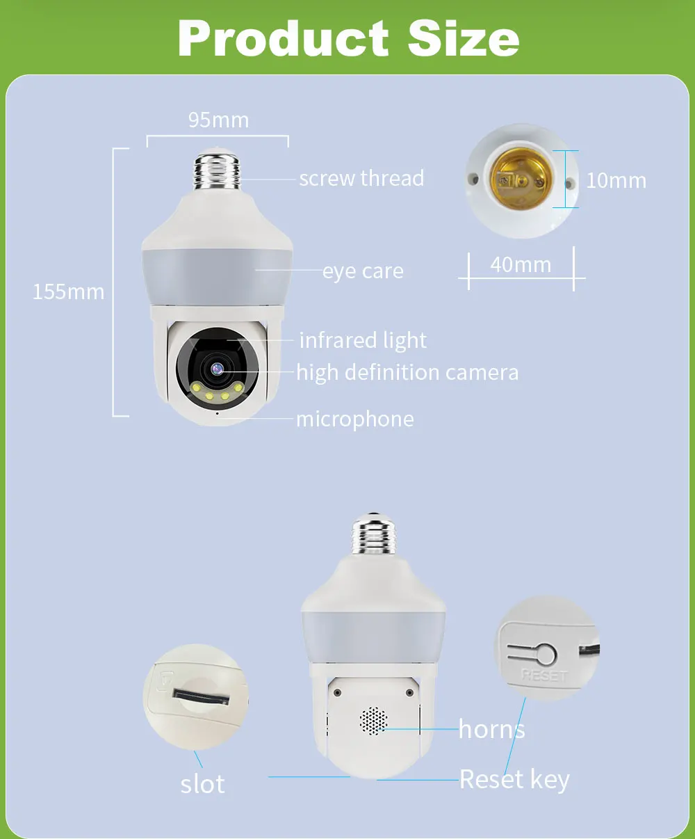 Function: *Remote control: monitor smart bulbs and WiFi cameras anytime, anywhere through APP. *LED bulb: The panoramic camera bulb can be turned on or off automatically, manually or periodically. *HD 5MP: 5 million pixel high-quality video footage, providing clear and delicate images. *WiFi connection: The bulb camera supports WiFi connection. (Only supports 2.4GHz routers) *Alarm function: When the bulb camera detects someone entering the shooting area in time, it will push an alarm notification to your mobile phone. *Two-way audio: Equipped with a built-in microphone and speaker, you can communicate with others through the camera. *Pan and tilt: Control the rotation to any corner you want to check in the application to protect your home safety. *Dual light night vision: Equipped with 4 white LEDs and 4 infrared LEDs, you can see clear images even in a completely dark environment, supporting full-color night vision. Packing list: 1*Light bulb camera (without TF card) 1*E27 base 1*User manual 1*Screw package Note: Alexa/Goggle function is not enabled by default, activation requires additional fee!!!