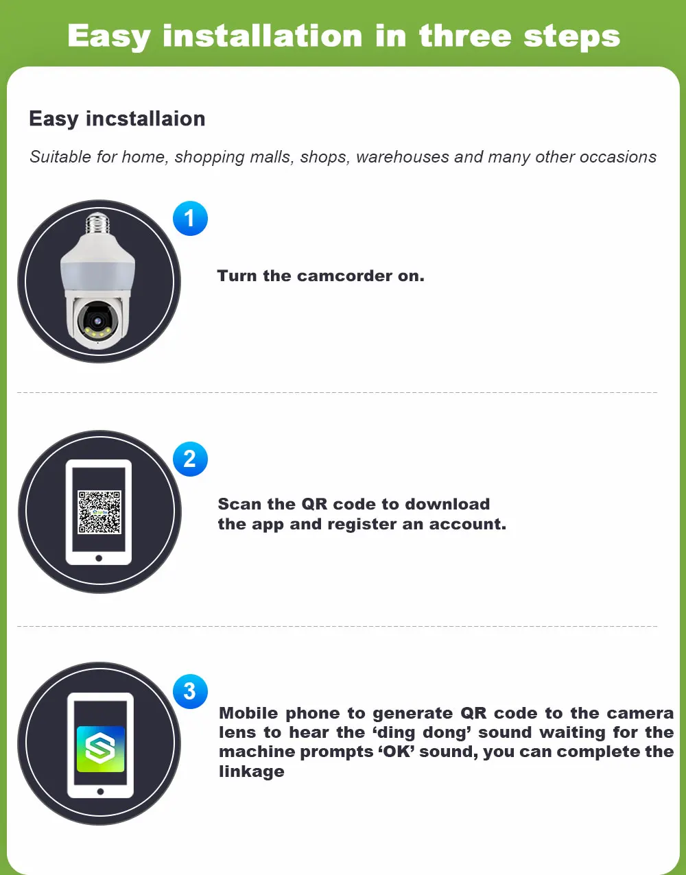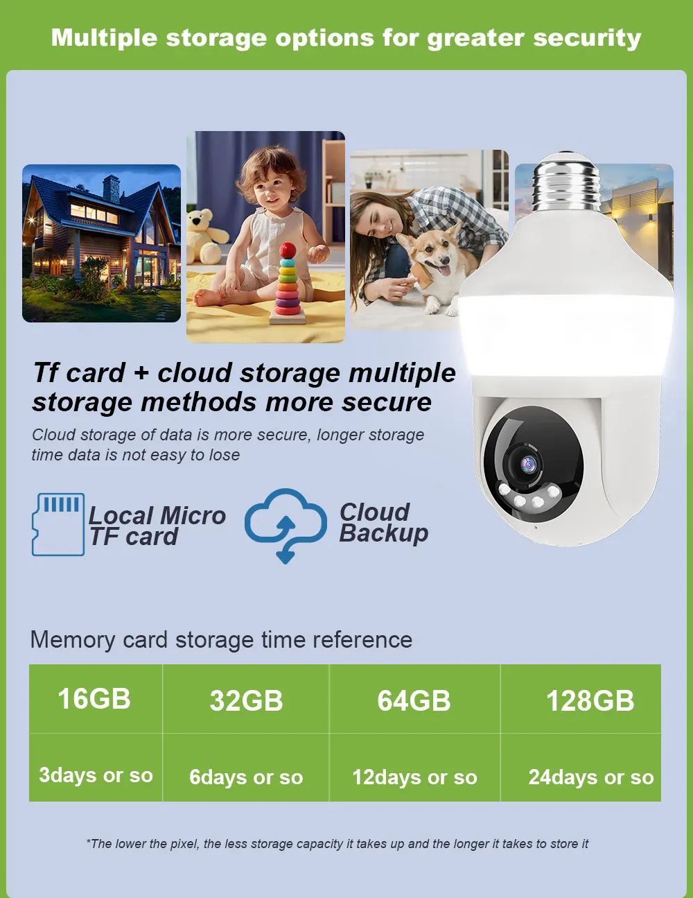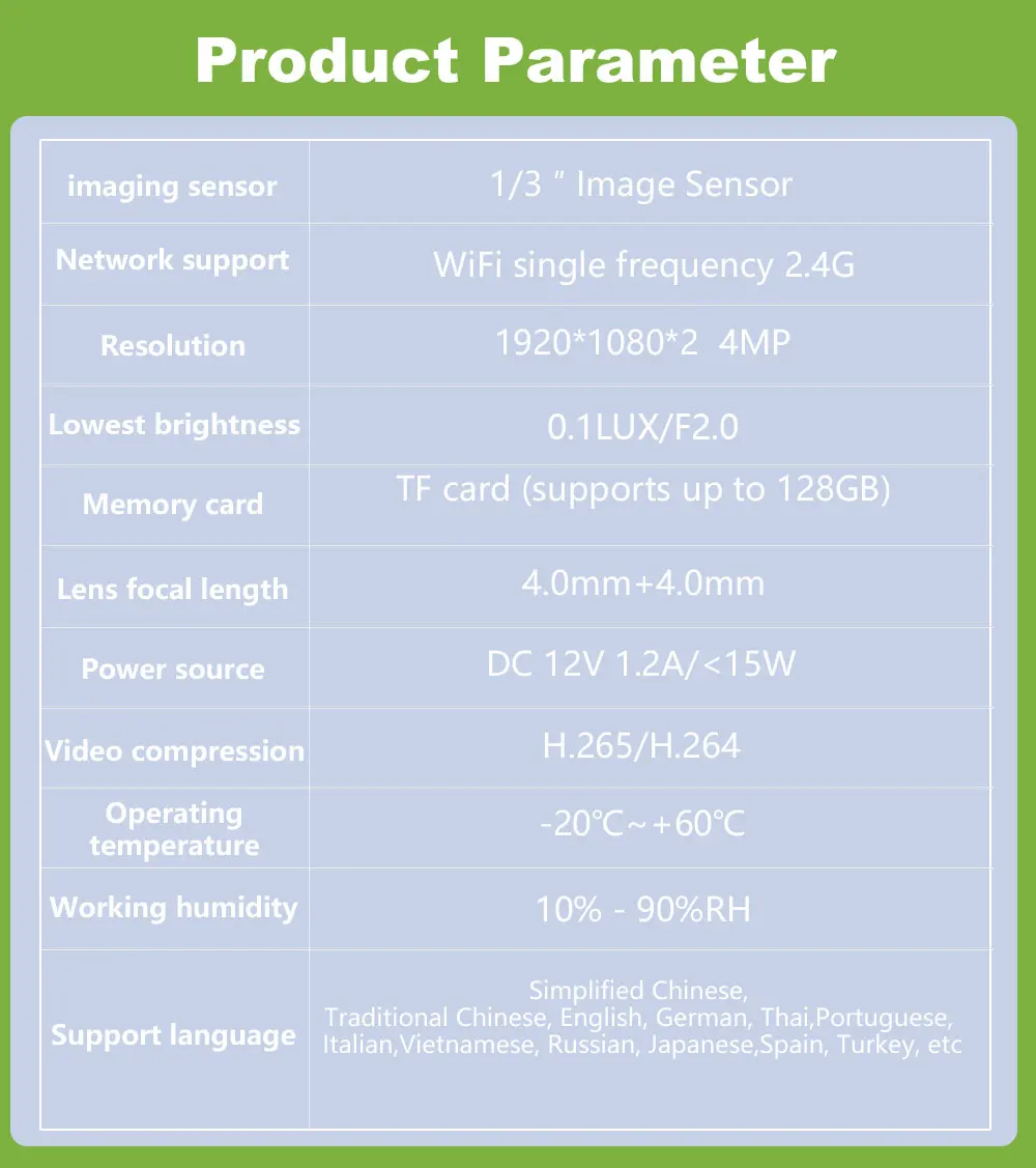 Function: *Remote control: monitor smart bulbs and WiFi cameras anytime, anywhere through APP. *LED bulb: The panoramic camera bulb can be turned on or off automatically, manually or periodically. *HD 5MP: 5 million pixel high-quality video footage, providing clear and delicate images. *WiFi connection: The bulb camera supports WiFi connection. (Only supports 2.4GHz routers) *Alarm function: When the bulb camera detects someone entering the shooting area in time, it will push an alarm notification to your mobile phone. *Two-way audio: Equipped with a built-in microphone and speaker, you can communicate with others through the camera. *Pan and tilt: Control the rotation to any corner you want to check in the application to protect your home safety. *Dual light night vision: Equipped with 4 white LEDs and 4 infrared LEDs, you can see clear images even in a completely dark environment, supporting full-color night vision. Packing list: 1*Light bulb camera (without TF card) 1*E27 base 1*User manual 1*Screw package Note: Alexa/Goggle function is not enabled by default, activation requires additional fee!!!