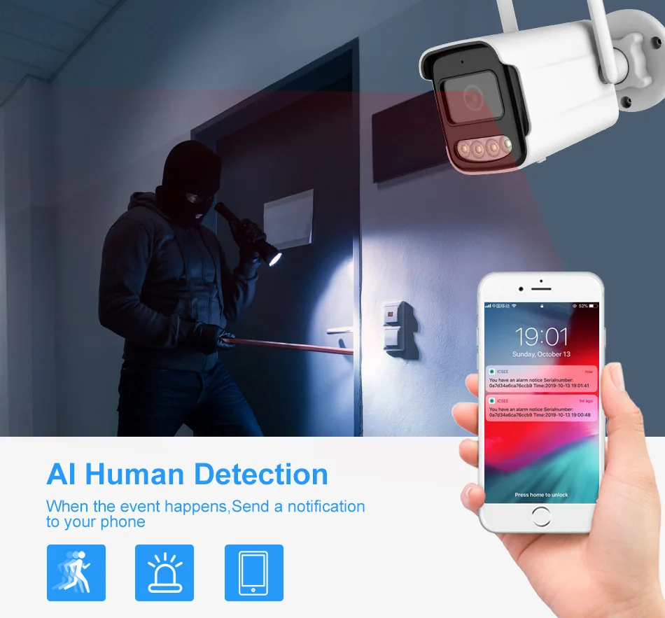 3. Support light alarm and voice alarm: set intelligent alarm night mode for the camera in Ai mode, when it detects people at night, its white light will light up; voice DIY let it say something when motion is detected to force intruders to leave your house;