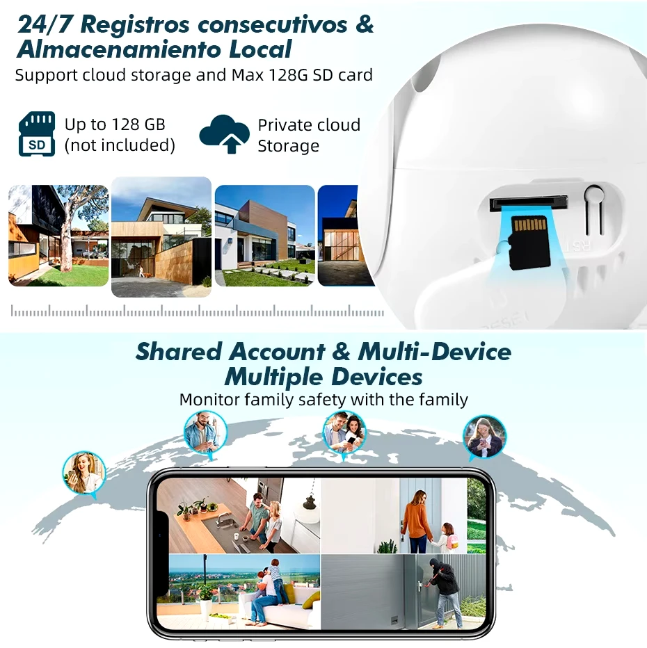 This ip camera can be shared to your family or friends, ask them to register account to receive the shared camera permission. Supporting Multiple Users watching live video at the same time via phone APP.